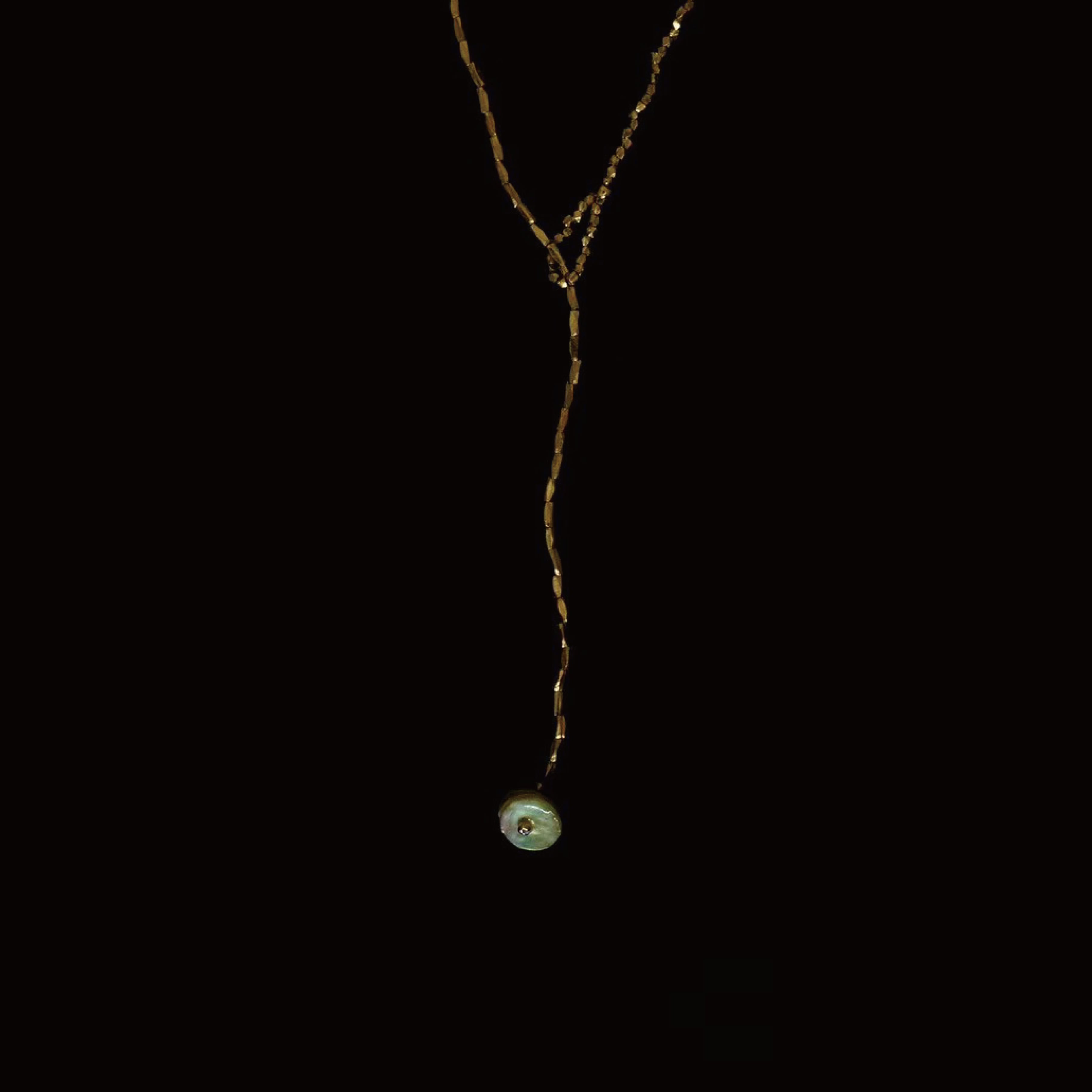 輪っかにマザーオブパールのボタンを通して長さの調整が可能。